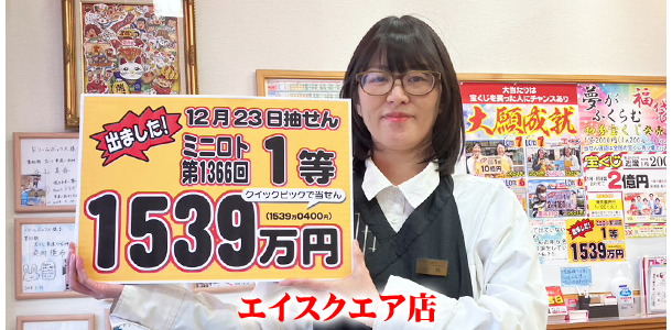 | エイスクエア店 2024.12.31抽せん 宝くじ 全国第1031回 3等 1,000,000円 |